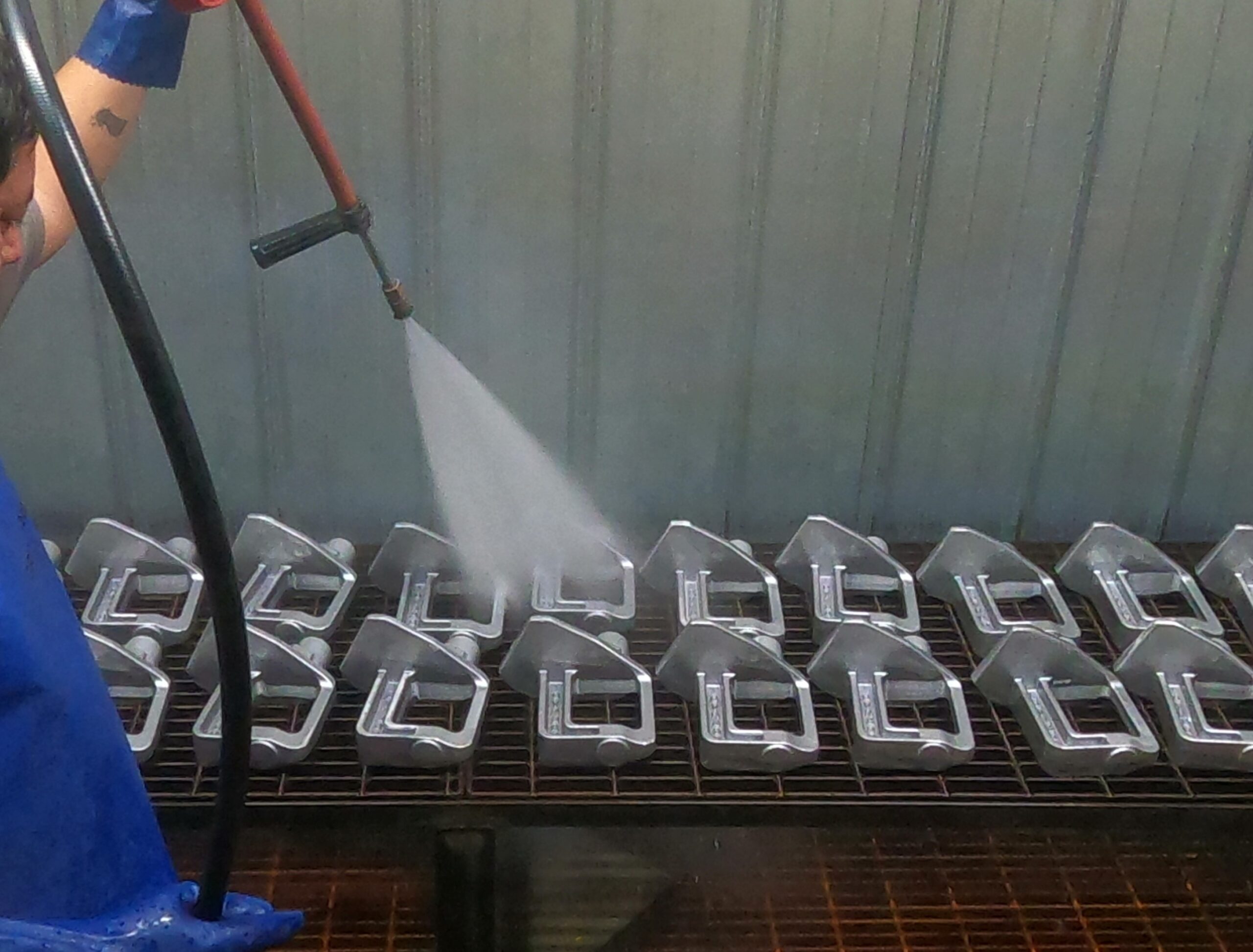 Acid cleaning (using iron phosphate acid solutions and zirconium) dissolves and removes rust, scale, mineral deposits, and stubborn oxidation that basic washing or degreasing can’t fully eliminate. By chemically etching the metal surface, acid cleaning creates a slightly roughened, clean profile. This helps the powder coating bond more securely, reducing the risk of peeling or flaking later. A properly acid-cleaned surface ensures that the powder coat cures evenly and consistently, improving durability, corrosion resistance, and the overall lifespan of the coating. Acid cleaning is usually used after degreasing and sometimes before or after media blasting, depending on the condition of the metal. It’s especially helpful for heavily rusted or aged parts.